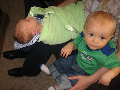 Kent has grown leaps and bounds. Ammon has mercilessly been trying to get Kent to crawl, baiting him with Gerber Puffs. What Ammon calls crawling I would more call throwing a tantrum that results in small movements of the body in a forward direction. Needless to say he does make it across the room at least once a night through the tears. Kent loves to be where ever Mom is, whether it is doing the dishes or doing my hair and makeup. I try to do these things during his morning nap, but sometimes when that nap is cut short he ends up "helping". Here is what I mean...